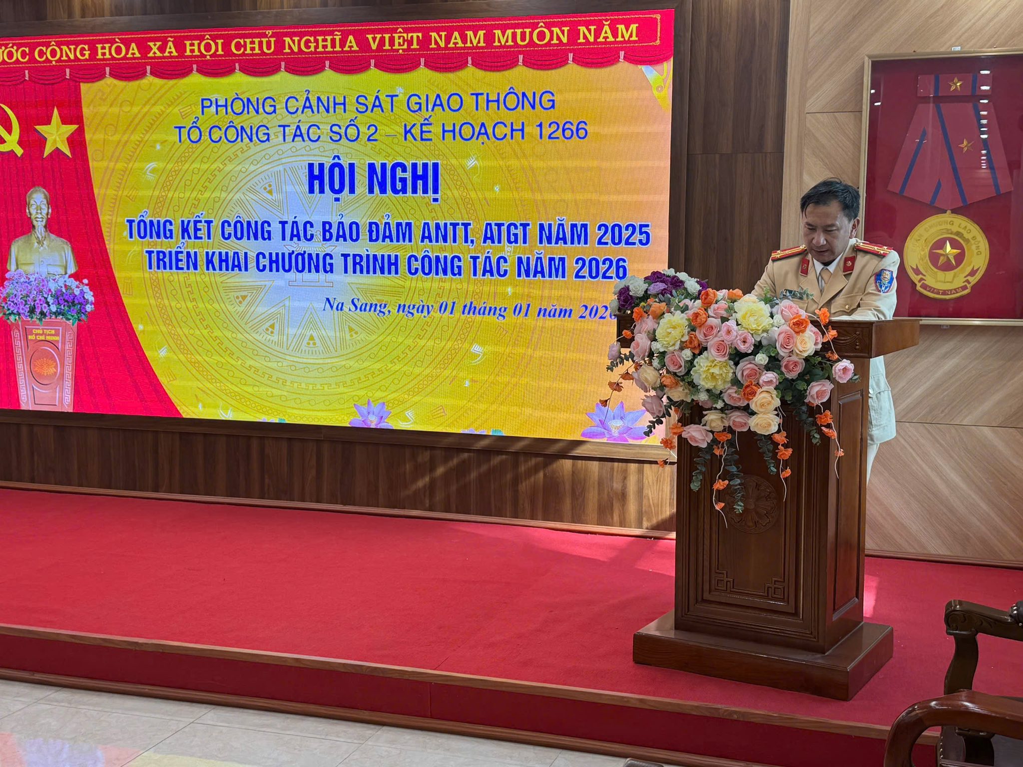 • Thực hiện Kế hoạch 2358/KH-BCĐ ngày 23/12/2025 của Công an tỉnh Điện Biên về Triển khai thực hiện Kế hoạch số 1266/KH-CAT-PV01 ngày 08/12/2021 của Công an tỉnh Điện Biên về tuần tra, kiểm soát, phòng ngừa, đấu tranh với tội phạm và vi phạm pháp luật hoạt động trên các tuyến giao thông địa bàn tỉnh Điện Biên năm 2026. Được sự nhất trí của Ban chỉ đạo KH1266 Công an tỉnh Điện Biên, ngày 01/01/2026 tổ công tác số 2-KH1266 Công an tỉnh Điện Biên long trọng tổ chức hội nghị Tổng kết công tác bảo đảm TTATGT-ANTT năm 2025, triển khai chương trình công tác năm 2026. Đến dự và chỉ đạo Hội nghị có đồng chí Thượng tá Vì A Hoà - phó trưởng phòng Cảnh sát giao thông Công an tỉnh Điện Biên; đồng chí Nguyễn Võ Nam - Phó Chủ tịch UBND xã Na Sang. Hội nghị đã thông qua báo cáo tổng kết công tác năm 2025 và đề ra phương hướng, nhiệm vụ trọng tâm năm 2026. Hội nghị đã nghe nhiều ý kiến thảo luận sôi nỗi đóng góp vào phương hướng nhiệm vụ trọng tâm năm 2026.