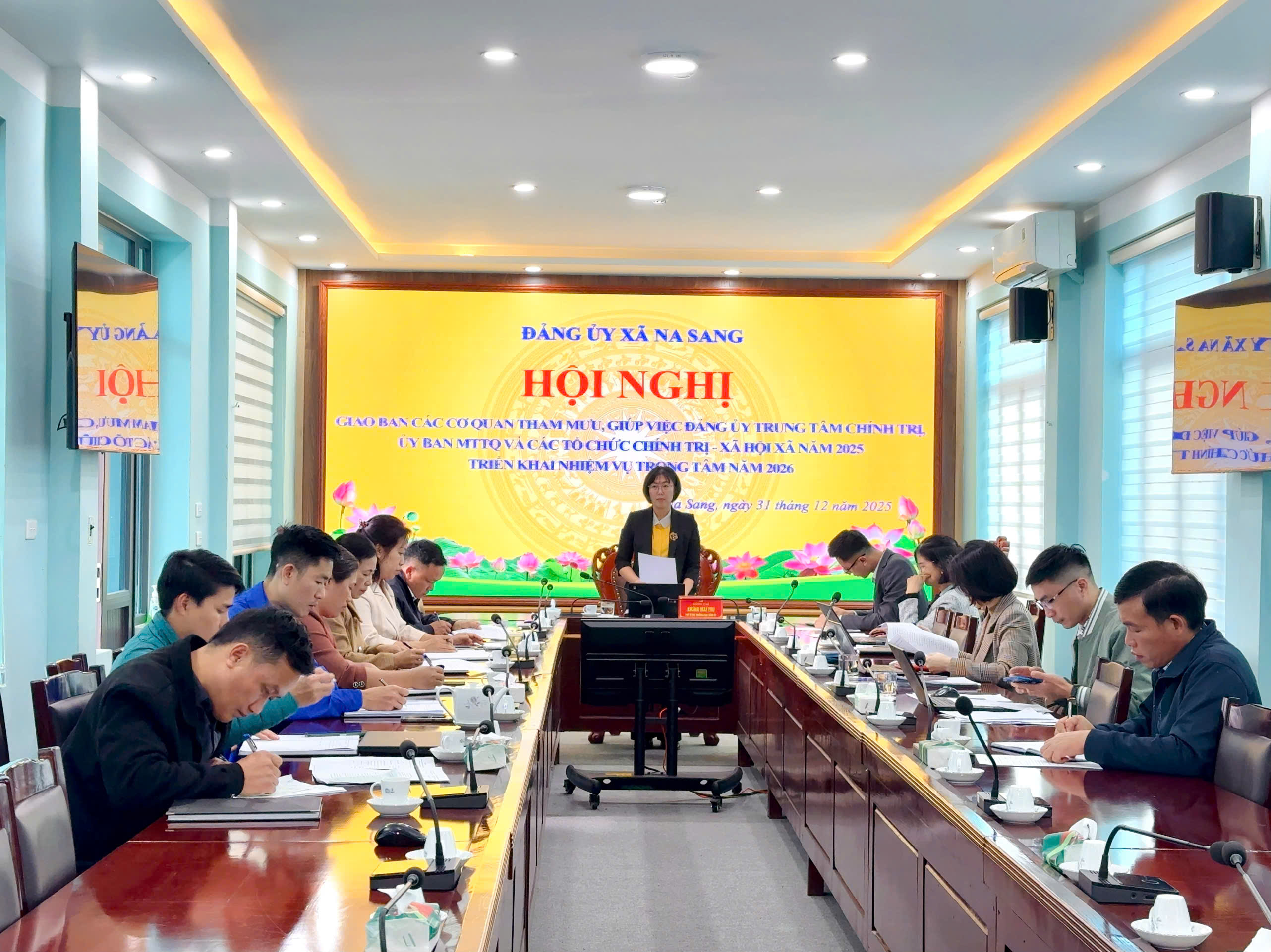 • Chiều ngày 31/12, Đảng ủy xã Na Sang đã tổ chức hội nghị giao ban các cơ quan tham mưu, giúp việc Đảng ủy, Trung tâm Chính trị, Uỷ ban MTTQ và các tổ chức chính trị xã hội năm 2025, triển khai nhiệm vụ năm 2026. Đồng chí Kháng Mai Thu - Phó Bí thư Thường trực Đảng uỷ xã chủ trì hội nghị.