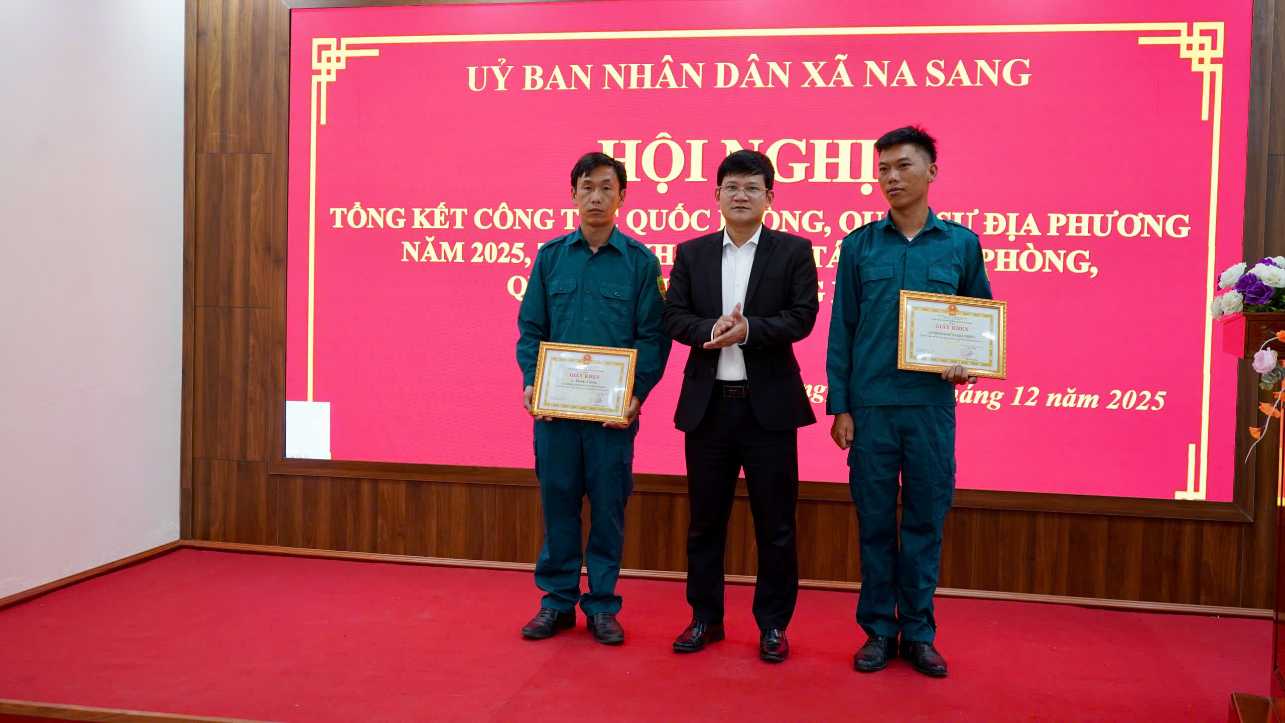 • Chiều 9/12, xã Na Sang tổ chức tổng kết công tác quốc phòng, quân sự địa phương năm 2025, triển khai phương hướng, nhiệm vụ năm 2026. Dự Hội nghị tổng kết có Đại tá Nguyễn Văn Đông, Phó Chỉ huy trưởng Bộ Chỉ huy Quân sự tỉnh. Cùng các đồng chí đại diện Khu vực phòng thủ 2; đại diện Đồn biên phòng Mường Mươn. Về phía xã Na Sang có đồng chí Kháng Mai Thu, Phó Bí thư Thường trực Đảng ủy xã; đồng chí Trần Hồng Quân, Phó Bí thư Đảng ủy, Chủ tịch UBND xã.